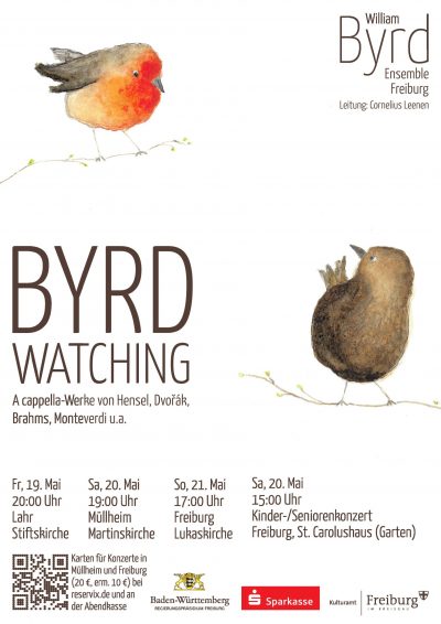 Im Jahr 2023 findet das 400-jährige Todesjahr von William Byrd statt. Das William Byrd Ensemble Freiburg möchte in zwei sehr unterschiedlichen Projekten dem Komponisten gedenken. Das erste Projekt im Mai 2023 zielt auf humorvolle Weise mit dem Titel „Byrd-Watching“ überhaupt nicht auf William Byrds Leben, sondern nur auf seinen Nachnamen. Es werden ausschließlich Werke erklingen, die sich mit dem fliegenden Getier befassen. Zahlreiche KomponistInnen haben sich mit verschiedenen Vogelarten befasst.