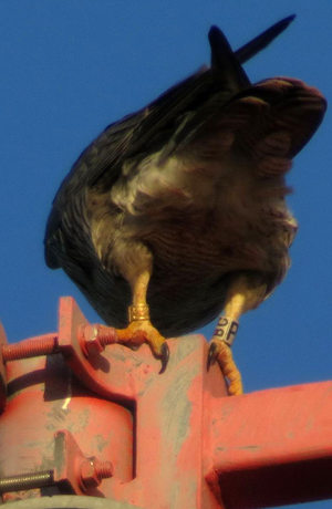 Wie auf dem Foto gut zu erkennen ist, ermöglichen die 2015 auch in Baden-Württemberg eingeführten Kennringe durch wenige große, auch aus größerer Distanz ablesbare Buchstaben auf dem Ring die eindeutige und individuelle Identifizierung eines Vogels. Beispielsweise lässt sich mit einem Spektiv bei 60-facher Vergrößerung die Ringkombination aus über 150 m Entfernung ohne Probleme ablesen. Eine weitere Möglichkeit bietet die Erfassung des Codes per Fotografie oder Digiskopie. Wir werden also im Glücksfall Lebensgeschichten von Wanderfalken schreiben können – ohne Fang oder Totfund. Dies wird hoffentlich mit dem Altbacher Wanderfalkenweibchen und der Hilfe der französischen Kollegen aus Strasbourg gelingen!