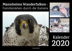Wie schon 2017 und 2018 ist auch für 2020 wieder ein großformatiger Kalender erschienen, der „Mannheims Wanderfalken – Familienleben durch die Kamera“ zum Thema hat. Gerhard Rietschel und Peter Böcker (Technik) haben mit Hilfe einer fernsteuerbaren HD Kamera unglaubliche Bilder aus dem Familienleben der Wanderfalken einfangen können. Angefangen mit Taubenbesuch am Horstplatz neben dem brütenden Falken über die mütterliche Hilfe beim Schlupf der Jungen bis hin zum „Taubenschlachten“ im Horst nach dem Ausfliegen der Jungen wird in mehr als 30 Fotos das Familienleben während der Brut 2019 geschildert.